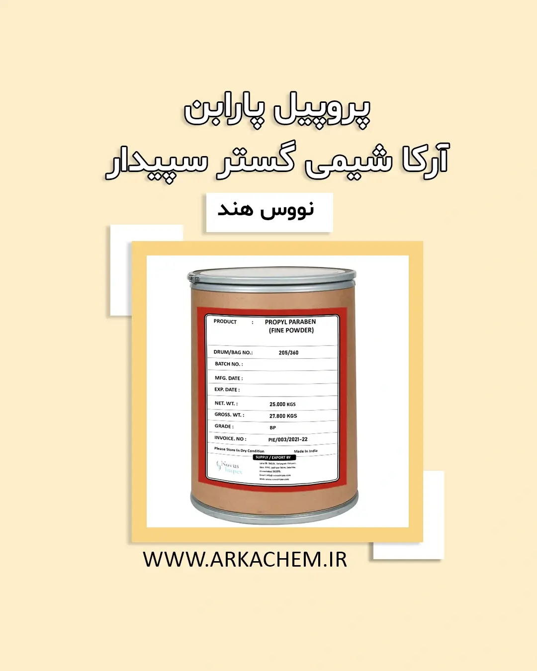 برای خرید پروپیل پارابن و دریافت قیمت پروپیل پارابن Propylparaben با برند نووس هند می توانید با شرکت آرکا شیمی گستر سپیدار وارد کننده مواد اولیه آرایشی بهداشتی با شماره های 02182801442 و 09026715830 در تماس باشید.